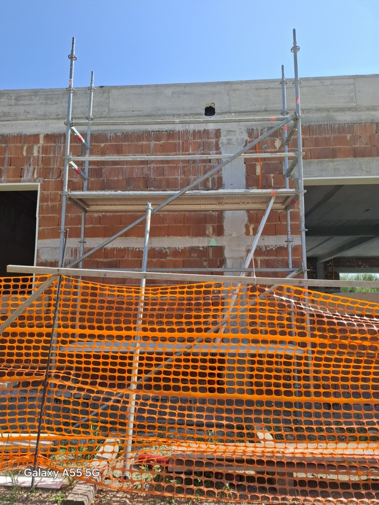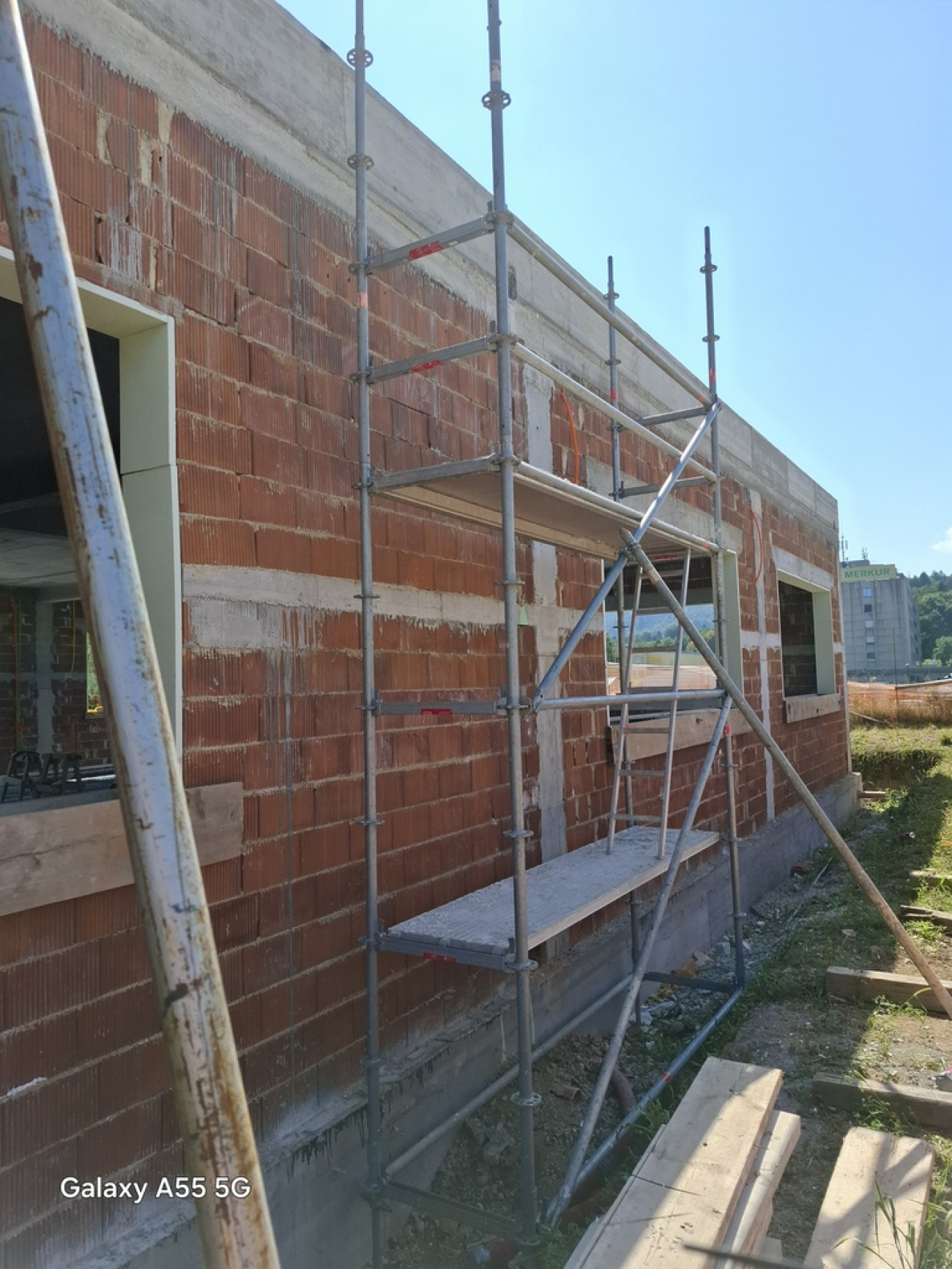 Na objektu je predvidena izvedba odtoka z ravne strehe v steni, za kar je potrebno izdolbsti v zid in plošče utor. Za varno delo je postavljen modularni oder, s katerim je mogoče določati višino stojišča na 50cm natančno. Za dostop na višje etaže je v odru integrirana lestev.