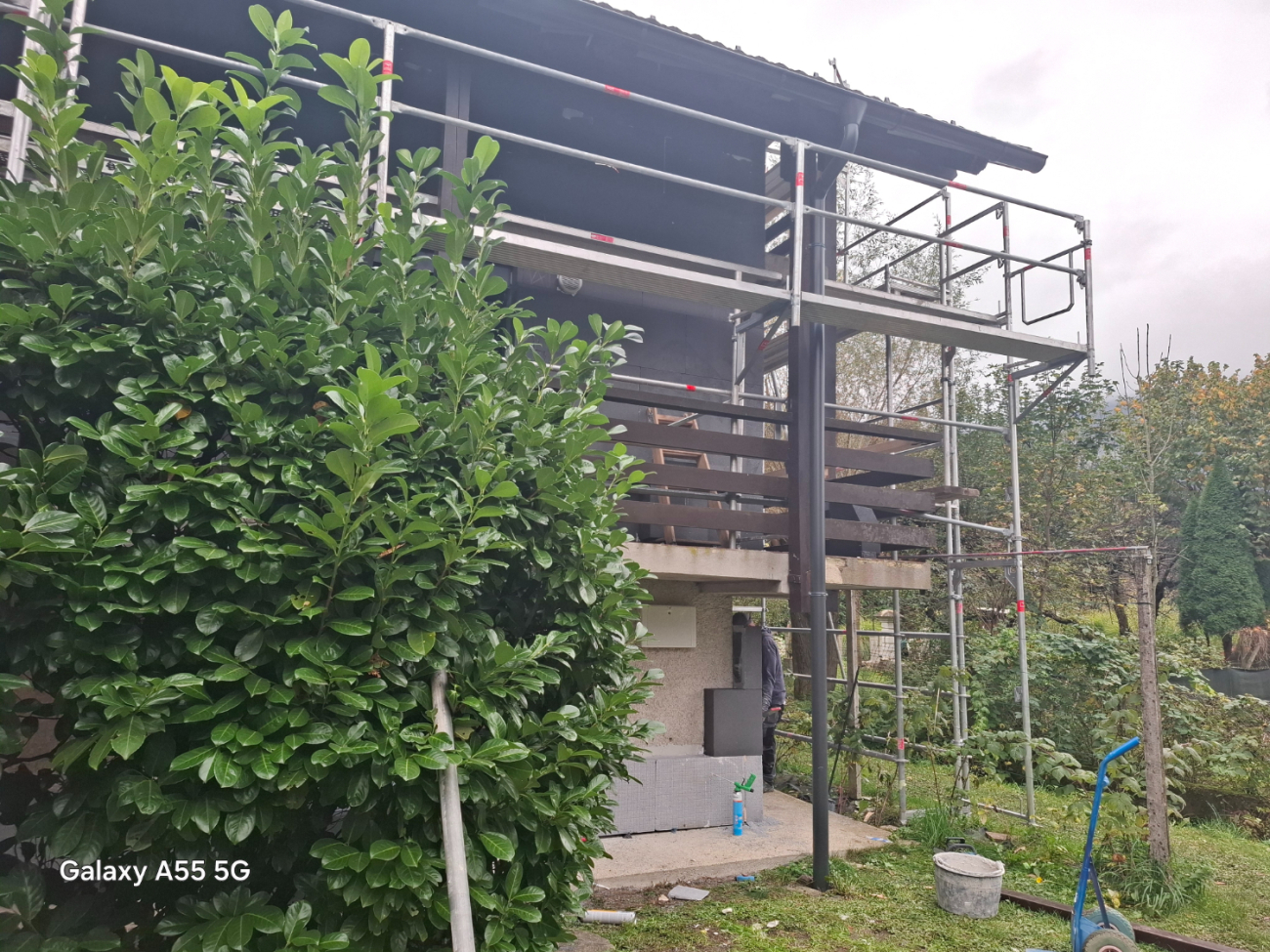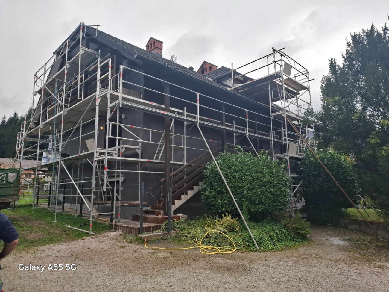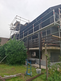 Na jeklenih kritinah s posipom je potrebno ustrezno izvesti zaščito in postaviti oder za pleskarska dela. V nasprotnem primeru pride do večjih mehanskih poškodb kritine, ker je nemogoče, da bi pleskarji ves čas dela pazili na svoj korak in je ne bi poškodovali. Za ta namen je bil postavljen oder pred frčado na stanovanjski hiši. Osnovni oder je bil postavljen za izvedbo fasaderskih del, dodatne razširitve pa pleskarska dela na lesenih napuščih in ograjah balkonov.